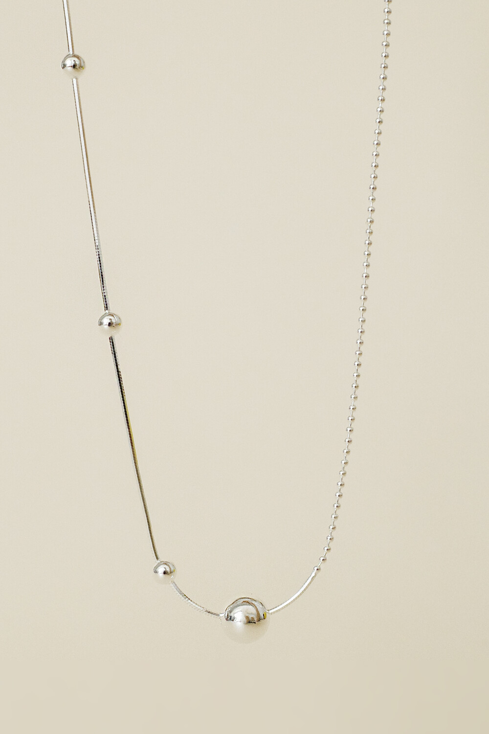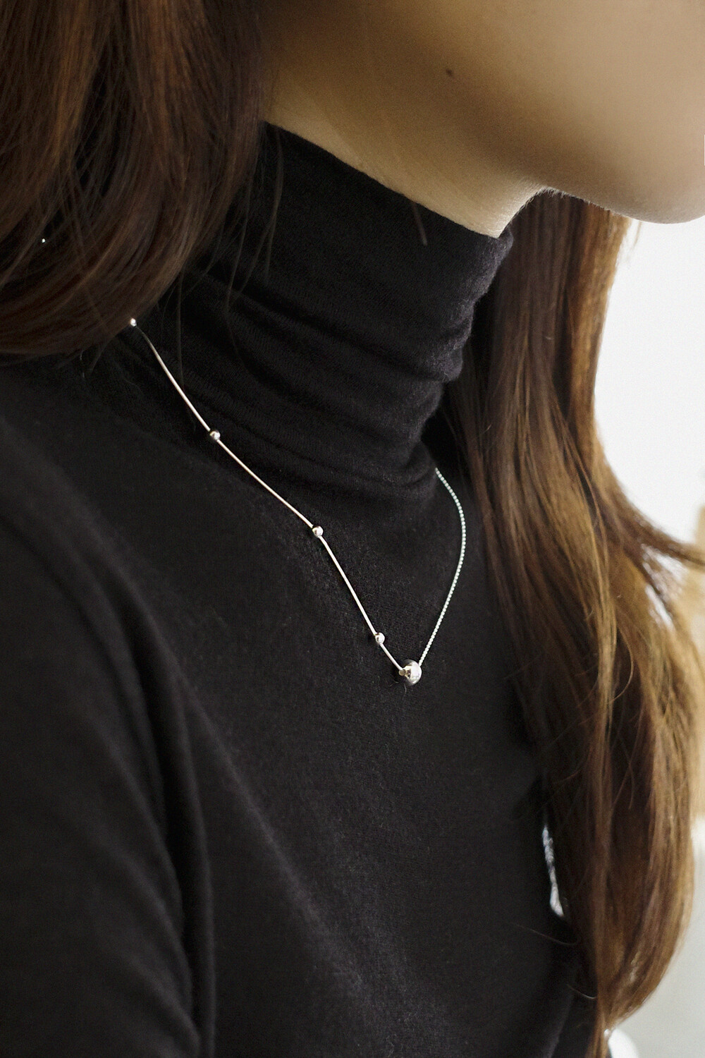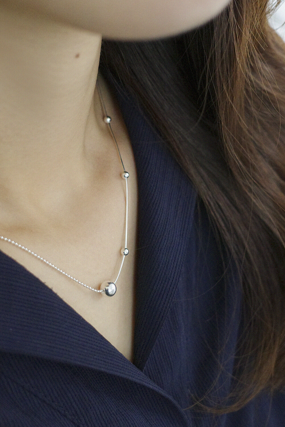 볼을 포인트로한 장식과 체인이 조화롭게 믹스된 목걸이입니다.