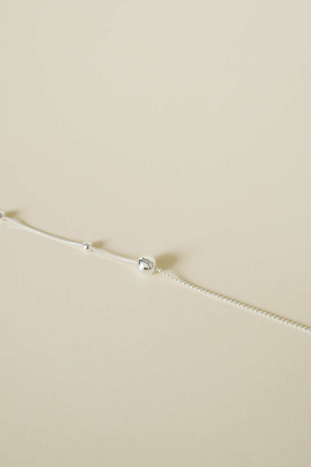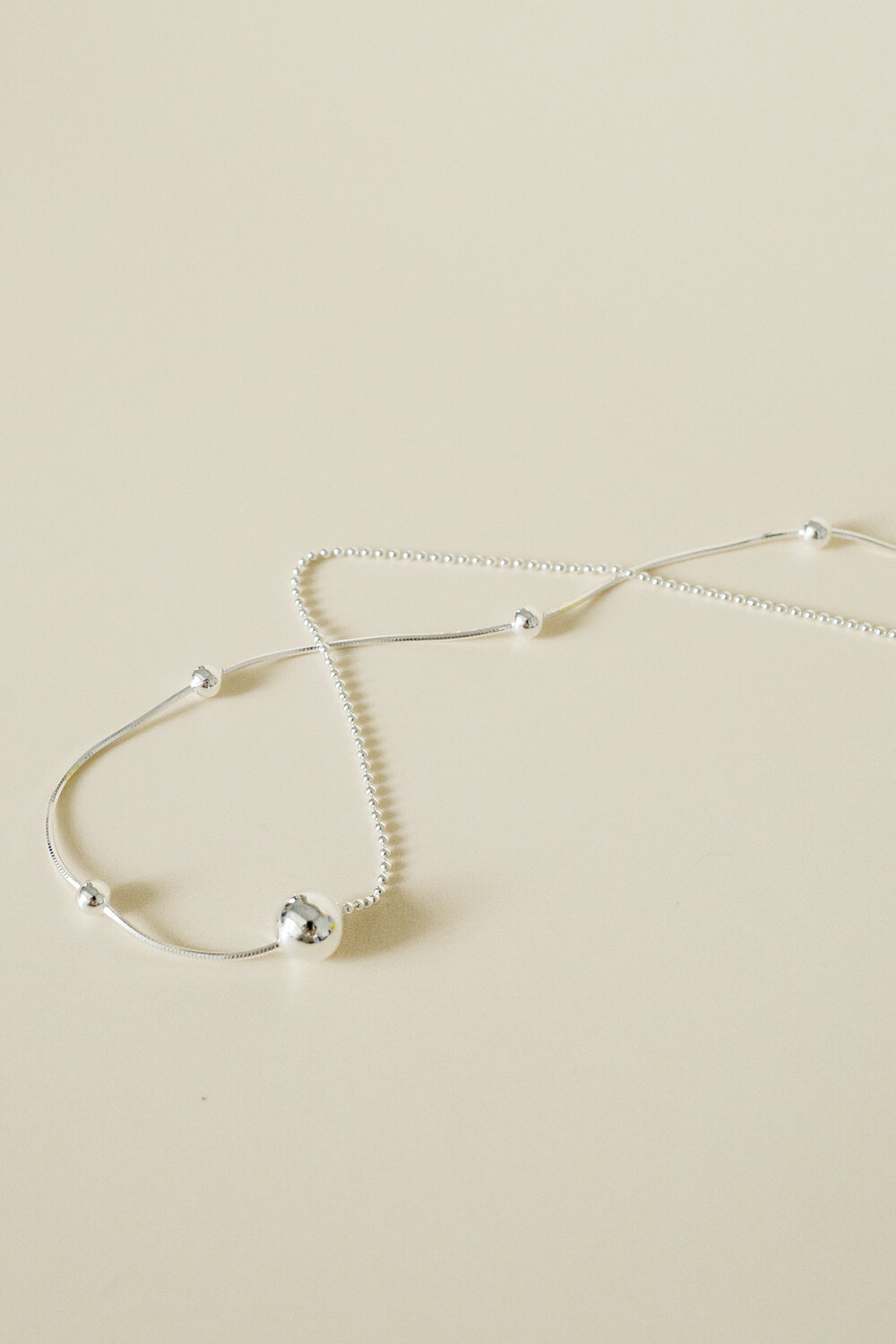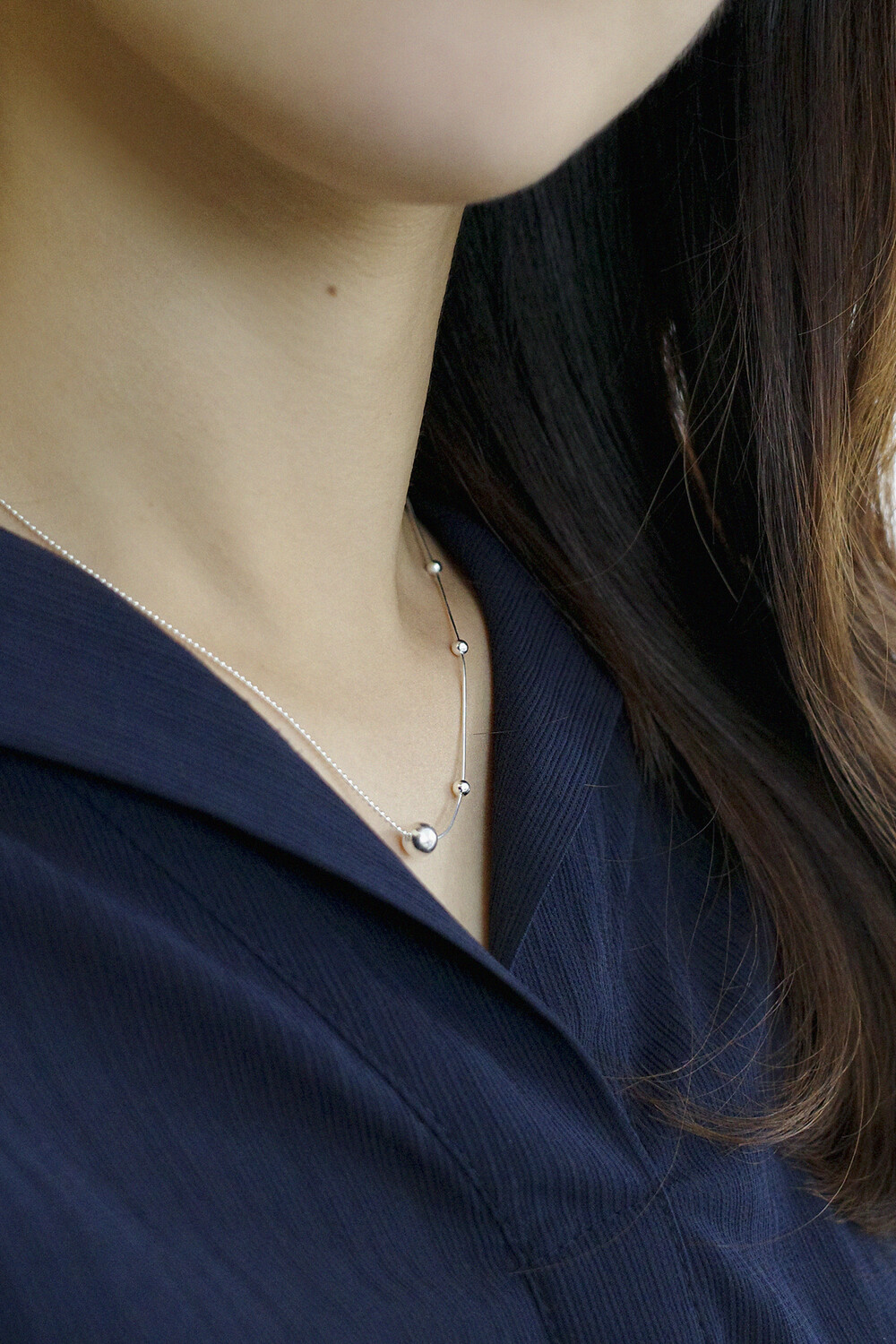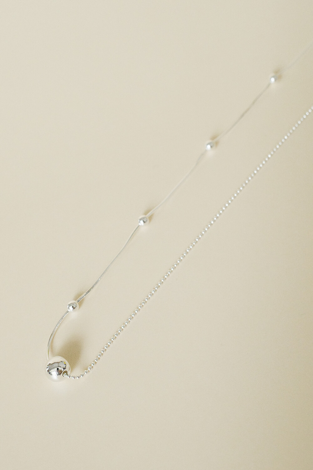 볼을 포인트로한 장식과 체인이 조화롭게 믹스된 목걸이입니다.