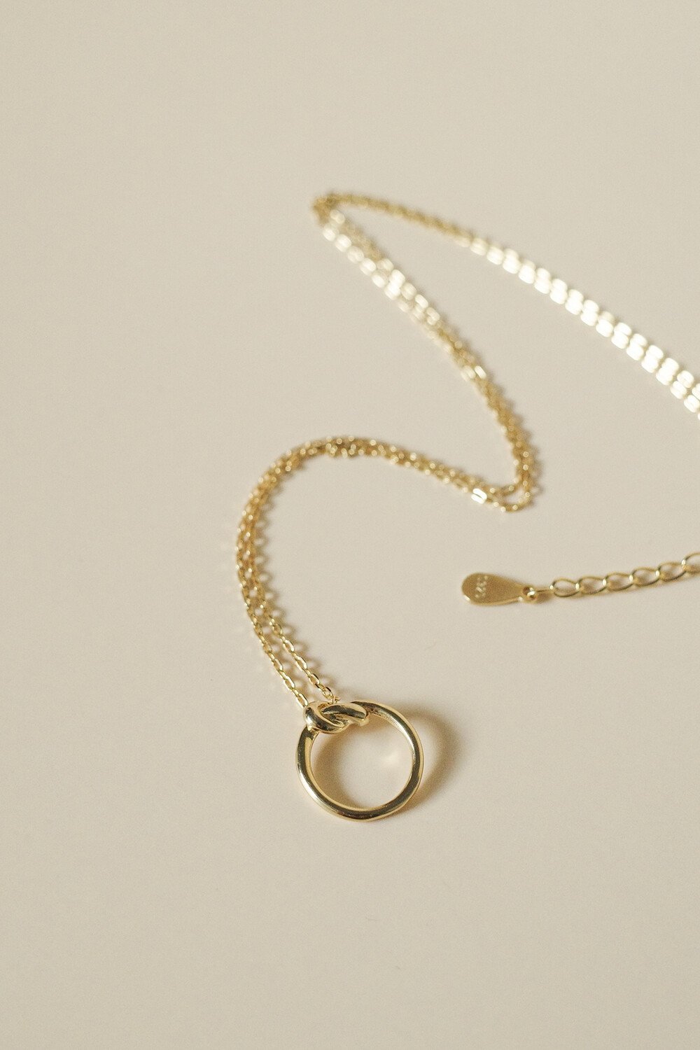 원형 펜던트에 매듭 장식이 더해진 목걸이입니다.